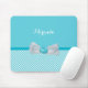 Fügen Sie eine Touch des Landcharmes Ihrer persönlichen Art mit diesem girly Aqua und weißem schrägem Ginghammuster mousepad mit einem niedlichen bloßen weißen Bogen hinzu, der mit hübschen Perlen und einem hellblauen Rosetteband verziert wird. Dieser weibliche hellblaue Entwurf kann personalisiert sein, indem er Ihren Namen addiert. Ebenedruckbild, nicht tatsächliches Band.