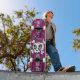 Niedlicher Schädel und Kreuzknochen mit Bogen auf einem farbigen lila Hintergrund mit polika gepunkteten Sternen und GIRLY SKATE Text.