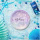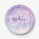 Niedliche Papiertafel mit farbenfroher rosa, lila, lila und blauer, einhornfarbener Regenbogenhaut funkelnd. Ihr individuelle Name und Monogramm sind in einem handgeschriebenen, eleganten Skript mit einem lila lila Einhorn Pinselstrich Stripe Hintergrund geschrieben.