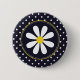 Ein Kreis-Knopf mit einer mädchenhaften, trendigen Blume mit einem gelben Zentrum vor marinebaublauem Hintergrund und einem trendigen blau-weißen Polka-Punktmuster auf der Außenseite.