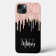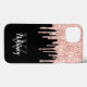 Stilvoll mit Monogramm Glitzer Tropfen iPhone 13 case - Layered rosa Glitzer Tropfen auf einem schwarzen Hintergrund mit einer anpassbaren weißen Skriptnamensvorlage und fett-monogramm in grau.