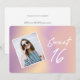Eine lustige und moderne 16 . Geburtstag Birthday Invitation Card mit angesagter Kalligraphie-Schrift, einem Gradientenhintergrund in Rosa, lila und Gelb. Die Einladung zum Geburtstag ist modern und süß! Passen Sie es mit Ihrem Foto der Wahl auf der Vorderseite und Ihrem eigenen Text und Informationen auf der Rückseite an.