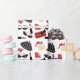 Packpapier, das ein girly rotes themenorientiertes Muster der Geldbeutel, des Parfüms, der Rubine, des Lippenstifts und der Sonnenbrille kennzeichnet.