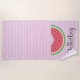 Dieses sommerliche Strandtuch mit einer lustigen Wassermelone auf einem heißen rosa und weißen pinstrierten Hintergrund ist mit dem Namen Ihres Kindes personalisiert.