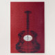 Schöner Abend auf einem Dock mit Musikthema. Roter Himmel mit Mond in der Gitarre.