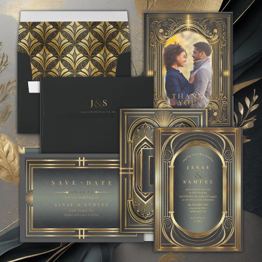 Dieses elegante Kartendeck ist Teil einer hochmodernen Art Deko Hochzeitssuite mit luxuriösen Rahmen und aufwändigen, glänzenden Golddetails. Die klassischen Designs strahlen einen glamourösen Vintagen Charme aus, mit einer schwarzen Farbpalette, leuchtendem Gold und warmen Grautönen. Die verzierten Details verleihen diesem zeitlosen Design eine Touch von Eleganz. Fügen Sie Ihre Initialen und das Hochzeitdatum einfach mit der bereitgestellten Vorlage hinzu. Suchen Sie nach ID1033, um weitere Hochzeitsprodukte im Design-Set zu sehen.