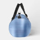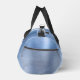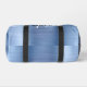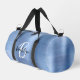 Diese personalisierte Duffeltasche ist mit einem Monogramm und einem Vornamen in modernem Schwarz-Weiß-Drehbuch auf einem glam blauen Imitat gebürstet Metall Hintergrund.