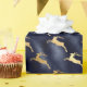 Dieses schicke Weihnachtsverpackungspapier zeigt ein Muster aus goldenen Imitaten und Rentieren, die auf dem Hintergrund der Folie aus marineblauen blauen Imitaten springen.