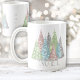 Elégante Mug Moderne Avec Arbres de Noël et texte NOEL En Argent Et Couleurs Pastel, Faux Détails Parties scintillant. Personnalisez facilement le texte au milieu ou laissez-le vide. - Kate Eden Art