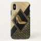 Glam iPhone X Gehäuse in Schwarz und Gold mit einem goldenen Paar von High Heels Set in schwarz und goldfarben Diamantform. Imitate mit goldener Folie und wirbelfarbenen Mustern verleihen diesem Gehäuse einen modernen, raffinierten Akzent. Personalisieren Sie den Namen, um Ihre Bedürfnisse Anzug.