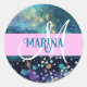 Glam mermaid aqua gold Glitzer Glitzern Monogramm Name und erste klassische Rundaufkleber. Individuelle Name und Monogramm sind in einem handgeschriebenen, eleganten Skript mit hellrosa Hintergrund geschrieben. Sie können die Textfarbe, den Schriftart und die Schriftgröße mit der Option Anpassen ändern.