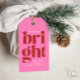 Lassen Sie Ihre Weihnachtsgeschenke mit diesem auffälligen, rosa Geschenkschild mit glitzerndem rotem, sequin-ähnlicher Text, der "Merry & Bright" heißt, höher schlagen. Die Rückseite des Geschenketiketts weist ein fröhliches rotes und rosa Streifen-Muster auf. Passen Sie den Tag an, indem Sie Ihre eigenen Grüße und Namen am unteren Rand hinzufügen, und können Sie die Hintergrundfarbe nach Ihren Wünschen ändern.