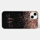 Glam Rose Gold Glitter Elegant Monogram iPhone Case. Easily personalize this trendy chic phone case design elegant rose gold sparkling glitter on a black background. The design feys your handwritten script monogram with pretty swirls and name.