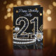 Celebrate a milestone 21st birthday in ultra-chic style with this personalized, luxurious greeting card. The design features the large "21" number prominently displayed, richly embellished with shimmering black faceted gems and surrounded by white brilliant diamond accents set against a bold black background. This elegant black and gold theme instantly communicates glamour and high-end sophistication, perfect for anyone turning 21.