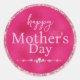 Diese Aufkleber-Etiketten zeigen ein glamouröses Muttertag-Thema auf einem hellrosa, metallischen Hintergrund. Der Gruß "Tag der glücklichen Mutter" wird in einem rosa Schriftart in der Mitte gedruckt. Unter dem Text befindet sich ein elegantes Band mit schönen rosa Diamanten. Ein rosa Glitzer umkreist die Aufkleber.