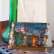 Denken Sie an Ihre Karte. Digitale Kunst. Handgezeichnete farbenfrohe Flaschen in meinem Küchenfenster bei Sonnenuntergang mit Regentropfen auf der Fensterscheibe.
