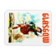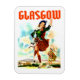 Glasgow-Magnet. Frauen tanzen in Schottland Kleid, Kilt, während ein Mann in Pfeife spielt an einem klaren Tag. Schottland Berge und eine Burg im Hintergrund.