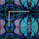 Die zersplitterten Formen, die mutig umrissen werden und geblasenes Glas andeutend, schaffen ein Kaleidoskopmuster der rosa, grünen, lila und blauen Farben.