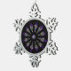 Ein hübsches Buntglasmuster schmückt diesen Zinnschneeflockenschmuck in dominanten Farbtönen lila, blau, gelb und schwarz. Zwölf abstrakte Federn umkreisen eine zentrale Maske, um ein spirituelles Mandala-Design mit einer indischen Empfindlichkeit zu bilden. Wunderschön für den Urlaub oder zu jeder Jahreszeit.