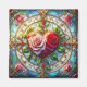 "Stetteter Glass Romance" - ein faszinierendes, farbiges Glaskunstwerk, das zeitlose Romantik und faszinierende Schönheit ausstrahlt. Im Zentrum steht ein Paar Rose - ein weiches Rosa, ein tiefrotes Rot - eingebettet in einen herzförmigen Rahmen, der Einheit, Leidenschaft und immerwährende Liebe symbolisiert. Umgeben von verzierten goldenen Mustern, üppigen grünen Blätter und zarten Rosenbuden, wird die Komposition durch ein lebendiges Kaleidoskop von Blues und Pastellfarben gerahmt.