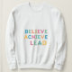 "Glaube an das Lead" wird in einem lebendigen, bunten Schriftart gedruckt und auf einem weichen T - Shirt aus Baumwolle in einem beruflichen, auffälligen Design präsentiert.