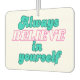 Mit diesem "Immer glauben an sich selbst" Automobil-Erfrischungsgerät setzen Sie Ihr Auto mit positiver und motivierter Kraft in den Griff. Jedes Mal, wenn Sie in Ihr Fahrzeug einsteigen, werden Sie daran erinnert, selbstbewusst, inspiriert und ermächtigt bleibe. Glauben Sie an sich und lass Ihnen, dass Sie mit diesem Auto Ihre tägliche Erinnerung sind, Ihre Träume zu verfolgen und Ihre Ziele zu erreichen.