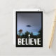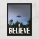 UFO-Bild mit fett "BELIEVE"-Text am unteren Rand