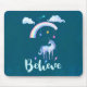 Ein Mauspad mit einer niedlichen Abbildung. Eine Aquarellfarbe, die unter einem Regenbogen mit flauschigen Wolken und schwindenden Sternen stehend ist. Typografie sagt "Glauben". Set auf dunkelblau grünem Hintergrund.