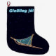 Ein Hund schlug mit einer aquamarinen Schlitten-Tasche, überlagert auf einem sternenförmigen Hintergrund. Der isländische Text "Gleðileg jól" (Frohe Weihnachten) erscheint in blau-weiß. Sie können den Strumpf personalisieren, indem Sie ein wenig Text auf den Schlitten hinzufügen.