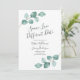 Diese botanische Hochzeit ändern das Datum flache Karte zeigt eine moderne Design-Vorlage mit den Worten "gleiche Liebe abweichende Datum" in handgeschriebenen schwarzen Skript mit Ihren neuen Hochzeitsdetails unten für Sie zu personalisieren grenzt an handgemalte Aquarell Eukalyptus Grün. Die Rückseite der Karte hat ein Foto für Sie, um Ihre eigenen anpassen. Herzlichen Glückwunsch für Ihre Hochzeit! Entworfen von Susan Coffey.