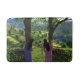 Zwei junge Damen blicken von hinter zwei Bäumen in eine üppige grüne Brille zwischen felsigen Hügeln, gefüllt mit kleinen Bauernhöfen, Hecken und Steinmauern und von einem glitzernden Bach bewässert, der die Hügel hinunter zieht.