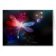 Glassierende, fliegende, rote Libelle mit durchsichtigen, detaillierten Flügeln auf dunklem, nächtlichem, leuchtendem Hintergrund mit tropischen Pflanze und Glühwürmchen. Rote Libelle.