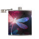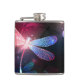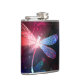 Glassierende, fliegende, rote Libelle mit durchsichtigen, detaillierten Flügeln auf dunklem, nächtlichem, leuchtendem Hintergrund mit tropischen Pflanze und Glühwürmchen. Rote Libelle.
