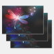 Glassierende, fliegende, rote Libelle mit durchsichtigen, detaillierten Flügeln auf dunklem, nächtlichem, leuchtendem Hintergrund mit tropischen Pflanze und Glühwürmchen. Rote Libelle.