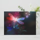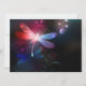 Glassierende, fliegende, rote Libelle mit durchsichtigen, detaillierten Flügeln auf dunklem, nächtlichem, leuchtendem Hintergrund mit tropischen Pflanze und Glühwürmchen. Rote Libelle.