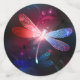 Glassierende, fliegende, rote Libelle mit durchsichtigen, detaillierten Flügeln auf dunklem, nächtlichem, leuchtendem Hintergrund mit tropischen Pflanze und Glühwürmchen. Rote Libelle.