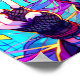 Anime glitchcore Girl, das ein Friedenszeichen mit Kopfhörern, musikalischen Noten und Fuchsohren farbenfroh lila, rosa, blau und schwarz ai art gibt.