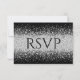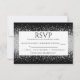 Eine moderne RSVP-Karte mit einem klassischen silbernen Glitzer-Effekt auf einem reinen schwarzen Hintergrund. Das Hotel ist Teil einer luxuriösen Hochzeitssuite mit passender Einladung, Speisekarte und vielen anderen Dingen.