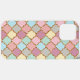 Schönes zeitgenössisches Bild von pastellrosa, weich gelb, hellblau, mint grün, violett lila, blassviolett, und Imitate glänzend goldfarbenen Glitzer, beliebtes französisches marokkanisches Quaterfoliengittermuster.