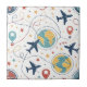 Vibrant seamless pattern ceramic tile featuring airplanes, globes, flight paths, stars, and travel-inspired icons in a playful aviation style. Ideal for travelers, aviation enthusiasts, frequent flyers, and anyone who loves global adventure aesthetics.