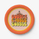 Helles und farbenfrohes Erntedank-Design mit "Gobble Gobble Gobble" in Retro-Typografie und Farben, mit dem Truthahn, der aus dem Text herauskommt.