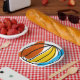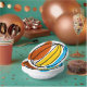 Abstraktes Design mit einer Retro-Touch aus der Mitte des Jahrhunderts, die eine Kugel in schwarz und ovale in hellblau, goldgelb und gebrannt orange auf weißem Hintergrund zeigt. Ein individuell anpassbares Design für Sie, um mit Ihrem eigenen Text, Bildern und Ideen zu personalisieren. Ein originelles digitales Kunstbild, das von Jess Perry bei QuirkyChic Retro erstellt wurde.