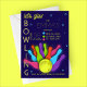 This vibrant glow-themed bowling birthday invitation features a bold retro-arcade aesthetic, perfect for kids and teens who love bright colors and fun, energetic designs. The layout showcases a glowing neon script headline (“let’s glow”), paired with dotted marquee-style lettering for a playful, modern look.