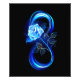 Luminous infinity symbol with glowing, beautiful, lushly blooming rose made of blue flames on black background.