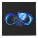 Luminous infinity symbol with glowing, beautiful, lushly blooming rose made of blue flames on black background.