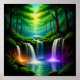 This whimsical poster features a vibrant fantasy forest scene with glowing orange and purple waterfalls cascading into a serene pool, symbolizing harmony between nature and mystical energy.