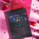 16 . Geburtstag Party Einladung im Dunkeln lila mit leuchtenden Neonbriefen und Buch. Ideal für ein Glühen in der dunklen Thematik.