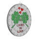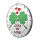 Glück in der Liebe. Zeichnungen von vierblättrigen Kleeblatten mit über ihnen schwebenden Herzformen.