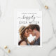 Moderne Save the Date Hochzeitserklärung. Die Vorderseite zeigt Ihr Foto "Save the Date für unser glückliches Ever After" in einer Mischung aus einfachen Typografie und trendigem Drehbuch mit Swashes und Ihren Vornamen und Hochzeitstag. Auf der Rückseite personalisieren Sie Ihre Nachricht detaillierter und fügen Ihre Namen in ein signaturähnliches Skript ein.