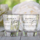 Modernes Braut- und Bräutiglienglas für Ihren persönlichen Sake oder als Gastgeschenk für Hochzeitsempfang, Probe-Dinner, Verlobungsfeier, Paarduschen und andere Hochzeitsfeiern mit "Happily Ever After" in einer Mischung aus modernem Drehbuch und eleganten und einfachen Schriften, Ihren Vornamen und Ihrem Hochzeitstag.